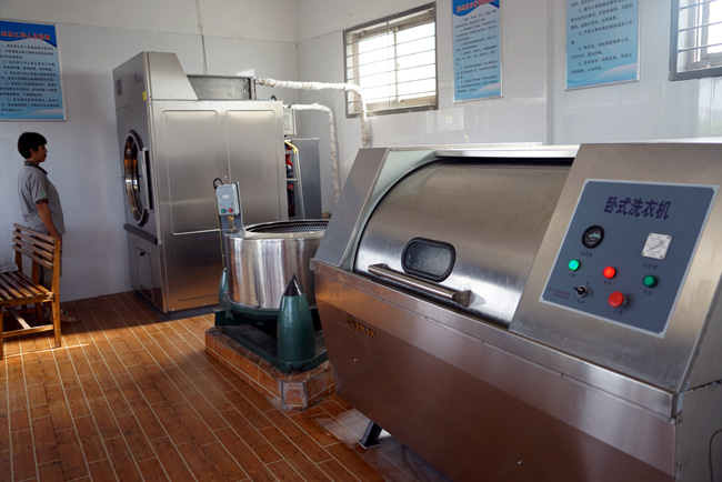 生產(chǎn)一線員工工作服臟得較快,有的在單位換洗,有的穿回家換洗,還有的懶于換洗,個別崗位由于工作環(huán)境較差,上班汗津津,下班臟兮兮,穿著不舒服,感覺不體面、無尊嚴(yán)。在管理提升、對標(biāo)學(xué)習(xí)活動中,集團(tuán)公司工會受中信重工集團(tuán)管理經(jīng)驗的啟發(fā),提出了建設(shè)洗衣房、為職工免費(fèi)洗衣的建議。李躍民董事長在聽取匯報后,當(dāng)即拍板確定洗衣房建設(shè)方案,郭峰總經(jīng)理到現(xiàn)場查看后,確定先在一鋁、二鋁建設(shè)試點(diǎn),再在發(fā)電、鋁加工等單位推廣。工會、工程管理部、貿(mào)易公司經(jīng)過多次考察論證,從硬件設(shè)施到軟件管理,定方案、出措施,利用鋁業(yè)一公司門崗閑置房進(jìn)行土建、電氣、供水、供汽改造,經(jīng)過為期一周的緊張施工,洗衣房土建改造和設(shè)備安裝全部結(jié)束,共安裝70公斤滾筒式工業(yè)洗衣機(jī)、蒸汽烘干機(jī)和甩干機(jī)各1臺,配備專用洗衣液和消毒液,對工作服統(tǒng)一編號、分類洗滌、烘干消毒,讓職工穿得干凈體面,工作開心舒心。