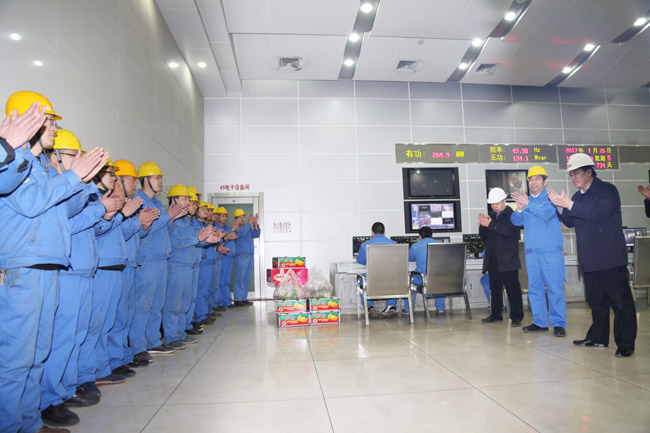 1月26日,縣長郅書安帶領(lǐng)四大班子領(lǐng)導(dǎo)到發(fā)電公司慰問一線員工,公司董事長李躍民、總經(jīng)理郭峰等陪同。